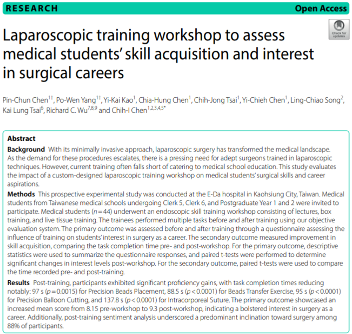 因此,2023年9月,義大醫院外科部團隊在高雄舉辦了一場全國性的微創工作坊,並在活動期間進行一個前瞻性研究,評估學員在精心策劃的訓練課程前後,對於基礎技能的掌握,以及對於外科的興趣等指標是否有顯著差異。