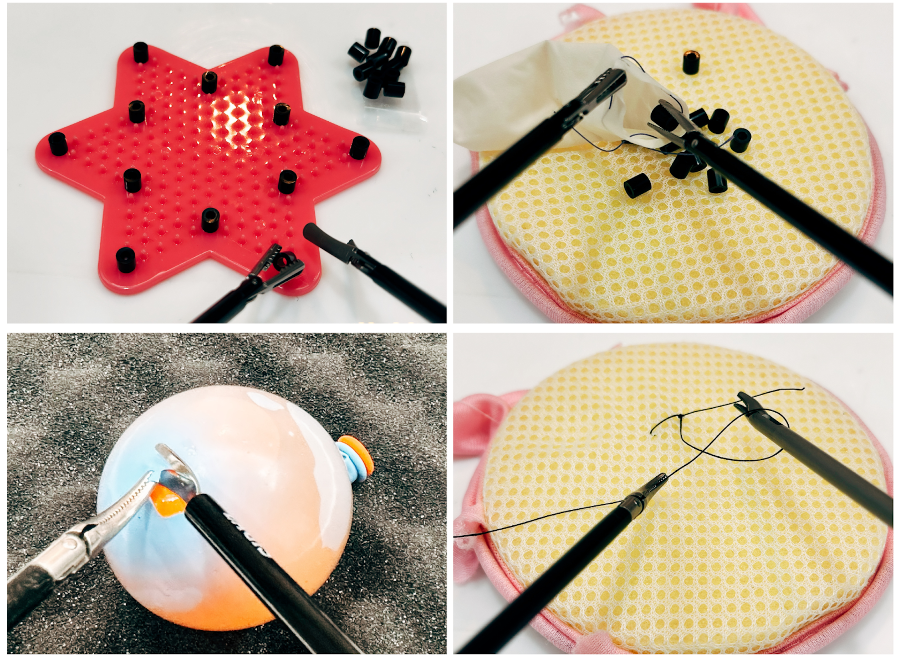 - 訓練四 - 體內縫合:在矽膠板和泡綿上練習穿針和打結的拆解動作後,在縫合模擬腹腔內縫合。