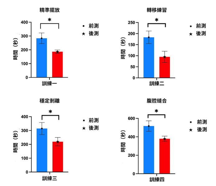 在所有課程中,後測的完成時間相較於前測均顯著縮短。「精準擺放」的平均完成時間從前測的283.6秒(SD ± 38.6)縮短到後測的186.6秒 (SD ± 12.2),平均減少97秒 ;「轉移練習」的平均完成時間從183.3秒 (SD ± 28.4) 縮短到94.8秒 (SD ± 25.4),平均減少88.5秒 ;「穩定剝離」的平均完成時間從314.3秒(SD ± 43.8)縮短到219.3秒(SD ± 30.3),平均減少95秒。「體內縫合」的平均完成時間從516.4秒(SD ± 56.7)縮短到378.6秒(SD ± 28.6),平均減少137.8秒。