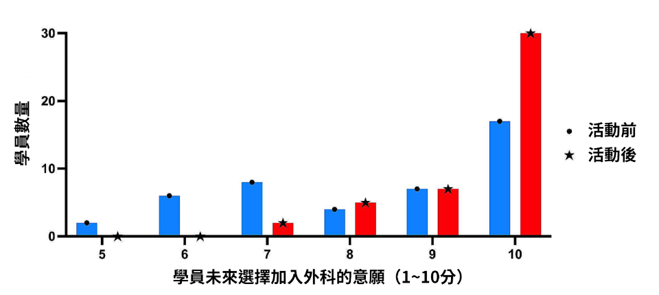此外,學員在活動前後對於外科的興趣有顯著的差異。活動前參與者的平均意願分數為8.15,中位數為8,得分範圍從5到10,表明參與者對外科作為職業的興趣從中等到高。在活動結束後,參與者回饋有了明顯的變化,平均意願分數上升到9.3,中位數上升到10,即量表的最高值。得分範圍縮窄到7至10。